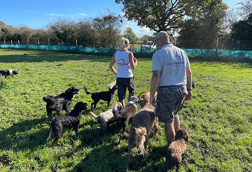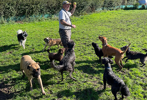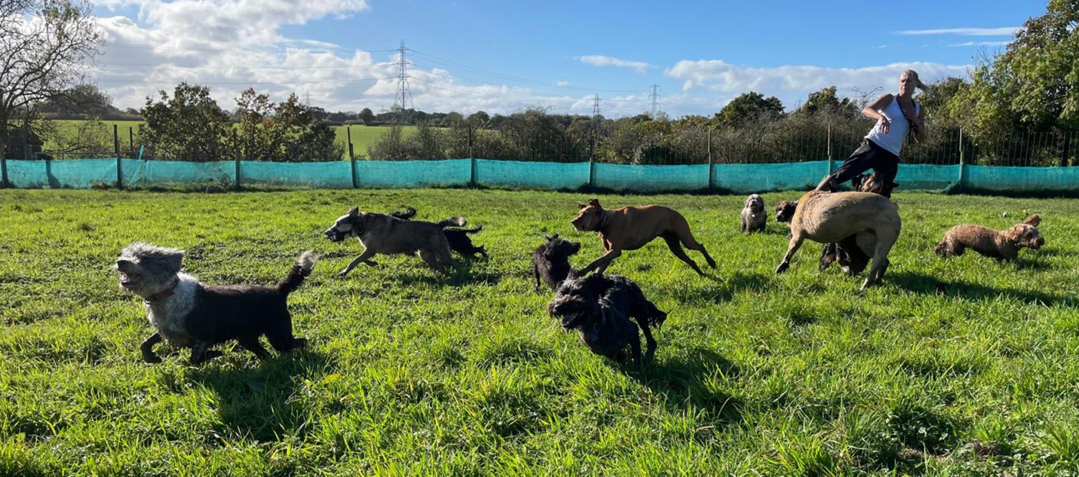 We offer daily dog walks (Monday to Friday) within a pack environment. If you're looking for your dog to burn off plenty of energy, enjoy lots of environmental stimulus and socialise with plenty of like minded friends then our dog walking service is just what you need. Pack walks are safely enjoyed on our own secure fields in the countryside, where dogs can explore the fields and ponds.