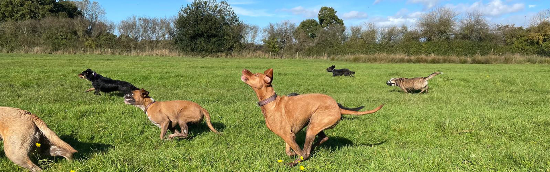We offer daily dog walks (Monday to Friday) within a pack environment. If you’re looking for your dog to burn off plenty of energy, enjoy lots of environmental stimulus and socialise with plenty of like minded friends then our dog walking service is just what you need. Pack walks are safely enjoyed on our own secure fields in the countryside, where dogs can explore the fields and ponds.